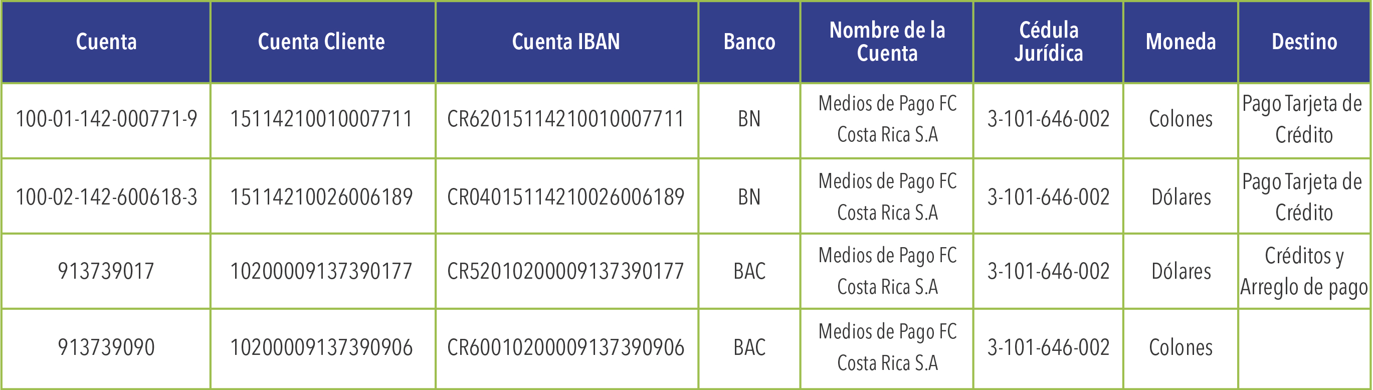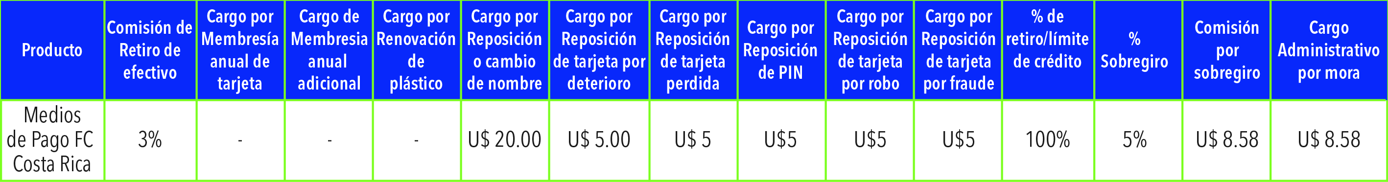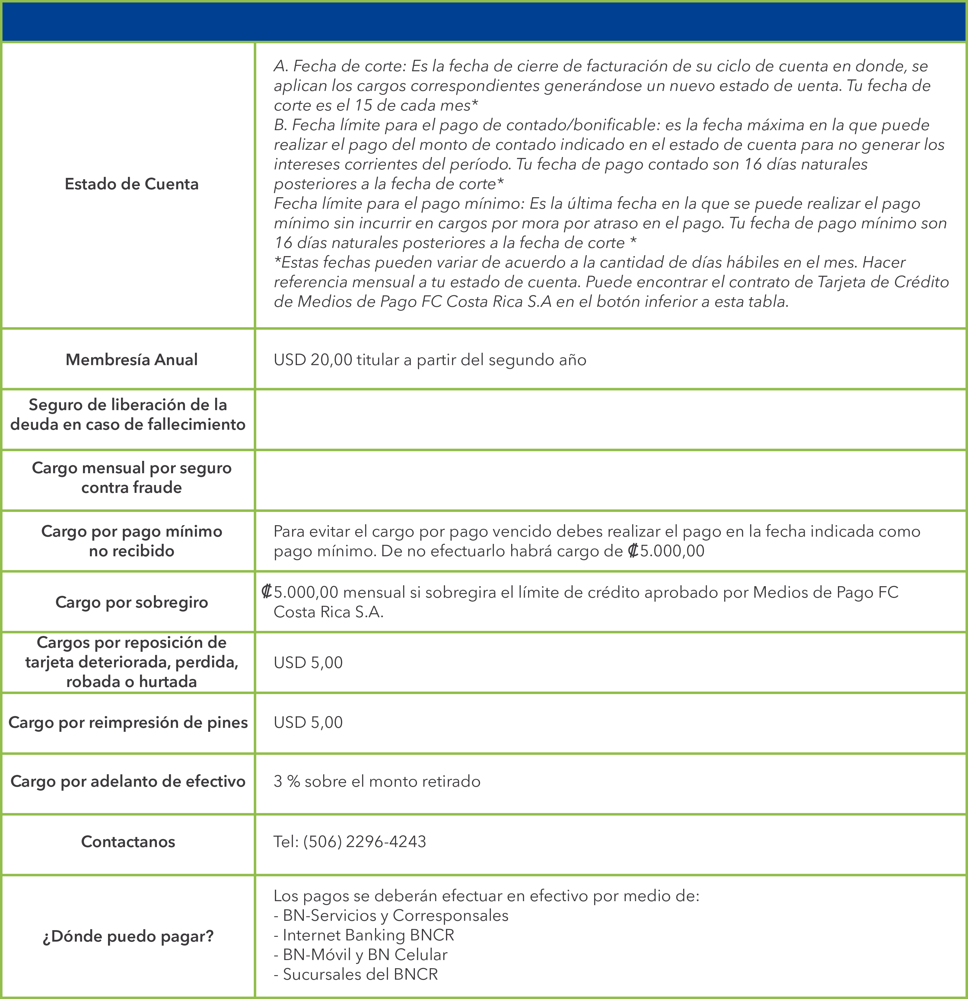 La línea de crédito es otorgada por Medios de Pago FC Costa Rica S.A. El presente, es un documento de información complementaria que se regirá por el contrato principal suscrito entre Medios de Pago FC Costa Rica S.A y el Cliente. Copia del contrato en mención, se encuentra a disposición de EL CLIENTE en nuestras oficinas a fin de que sea solicitado por el mismo cuando así lo requiera. Medios de Pago FC Costa Rica S.A. ofrece a sus clientes, de manera complementaria a los servicios contratados, el seguro de robo, pérdida y robo y fraude por un monto hasta el saldo adecuado al último día del mes. Esto es una facultad u opción adicional a la cual todo consumidor tiene, ya que cuenta con la facultad para contratar con otro proveedor de seguros.